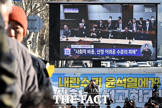 [더팩트ㅣ남윤호 기자] 윤석열 전 대통령의 내란 우두머리 혐의 1심 선고 날인 19일 오후 서울 서초구 서울중앙지법 인근에서 열린 촛불행동 집회에서 재판부의 1심 선고 재판이 생중계 되고 있다.