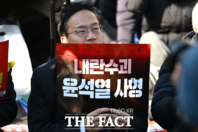 [더팩트ㅣ남윤호 기자] 윤석열 전 대통령의 내란 우두머리 혐의 1심 선고 날인 19일 오후 서울 서초구 서울중앙지법 인근에서 열린 촛불행동 집회에 박주민 더불어민주당 의원이 참석해 손팻말을 들고 있다.