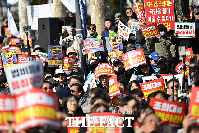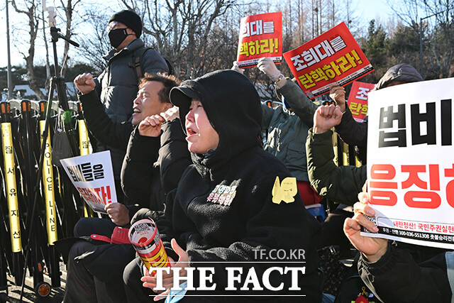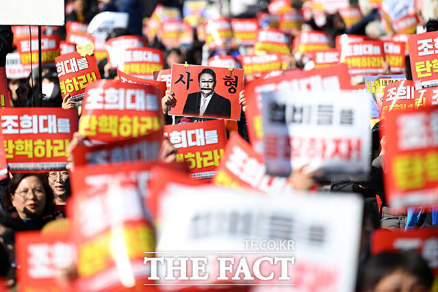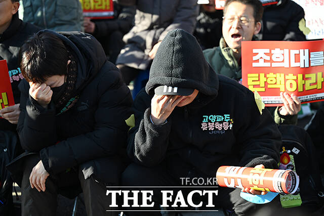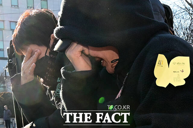 [더팩트ㅣ남윤호 기자] 윤석열 전 대통령의 내란 우두머리 혐의 1심 선고 날인 19일 오후 서울 서초구 서울중앙지법 인근에서 열린 촛불행동 집회에서 윤 전 대통령의 무기 징역형 선고에 참석자들이 고개를 떨구고 있다.