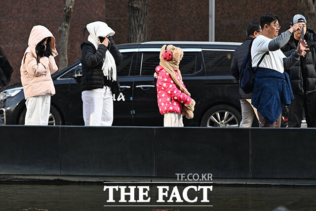 [더팩트 | 김성렬 인턴기자] 서울 아침기온이 0도를 기록한 20일 오전 서울 중구 세종대로 인근에서 한 외국인 관광객이 패딩 모자를 쓴 채 추위를 피하고 있다.