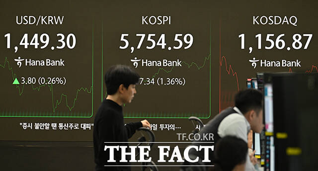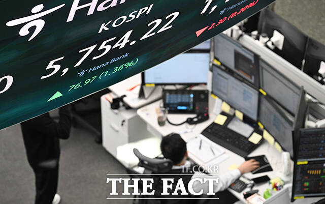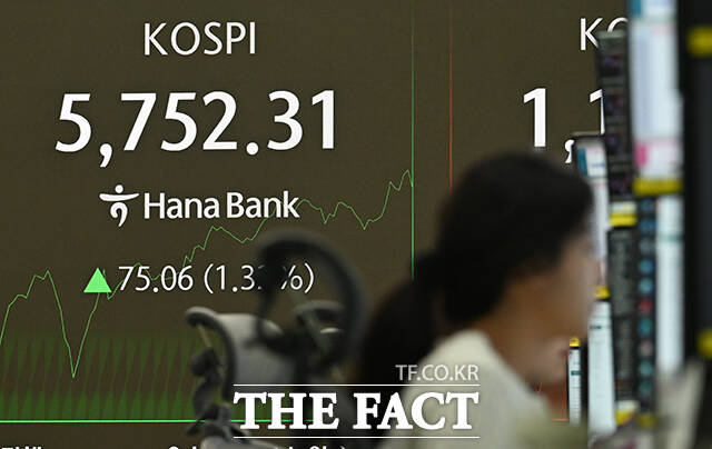 코스피 지수가 사상 처음으로 5700선을 넘어선 20일 오전 서울 중구 하나은행 본점 딜링룸 전광판에 지수가 표시되고 있다. /박헌우 기자