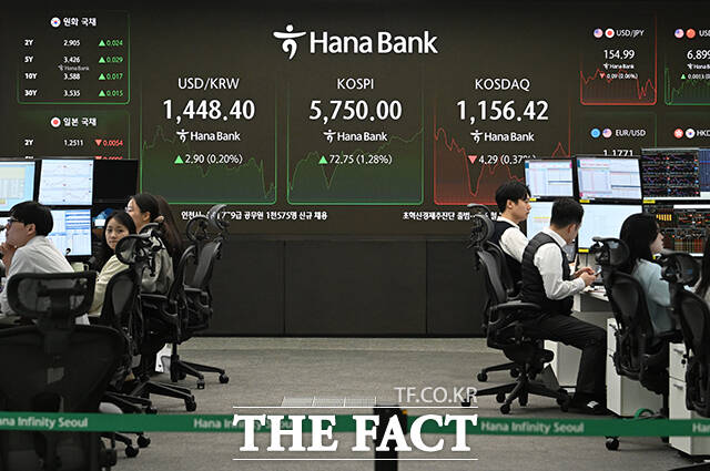 [더팩트ㅣ박헌우 기자] 코스피 지수가 사상 처음으로 5700선을 넘어선 20일 오전 서울 중구 하나은행 본점 딜링룸 전광판에 지수가 표시되고 있다.