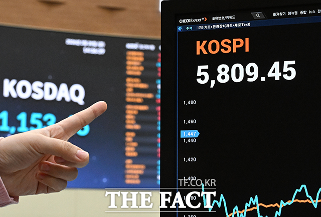 코스피가 5800선을 넘어 사상 최고치를 기록했다. 한국거래소에 따르면 이날 오후 2시 기준 코스피는 전 거래일 대비 2.17%(123.34포인트) 상승한 5800.59를 기록하고 있다. 5698.89로 거래를 시작한 코스피는 장중 5809.91까지도 치솟으며 장중 최고치를 경신했다.