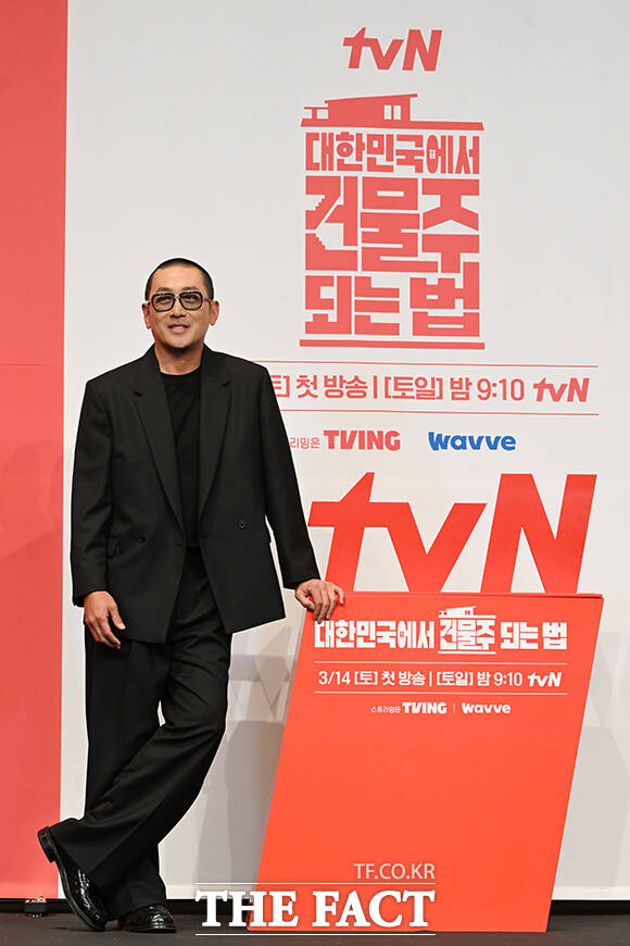 배우 하정우가 9일 오후 서울 구로구 더 링크 서울에서 열린 tvN 새 토일드라마 '대한민국에서 건물주 되는 법' 제작발표회에 참석해 포즈를 취하고 있다. /김성렬 기자