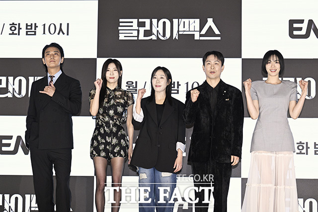 [더팩트 | 송호영 기자] 배우 주지훈, 하지원, 이지원 감독, 배우 오정세, 나나(왼쪽부터)가 10일 오후 서울 구로구 디큐브시티 더세인트 그랜드볼룸에서 열린 ENA 월화드라마 '클라이맥스' 제작발표회에 참석해 포즈를 취하고 있다.