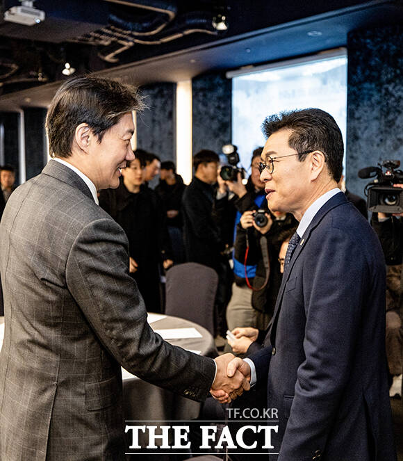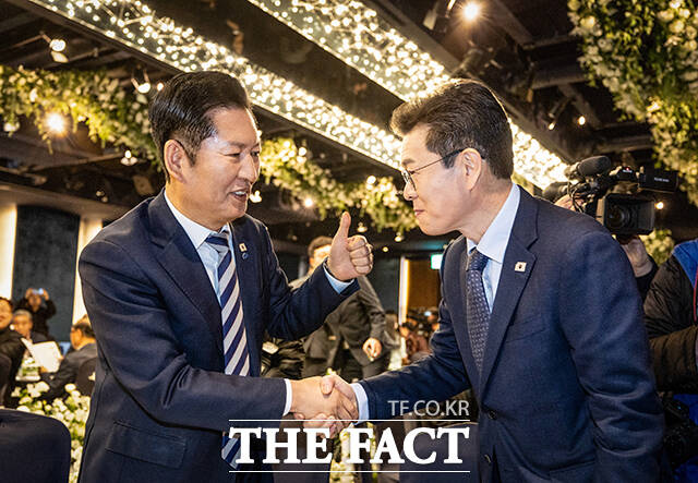 [더팩트ㅣ남윤호 기자] 정원오 더불어민주당 서울시장 예비후보(오른쪽)가 10일 오전 서울 영등포구 한국노총에서 열린 창립 80주년 기념식에 참석해 정청래 더불어민주당 대표와 인사하고 있다.