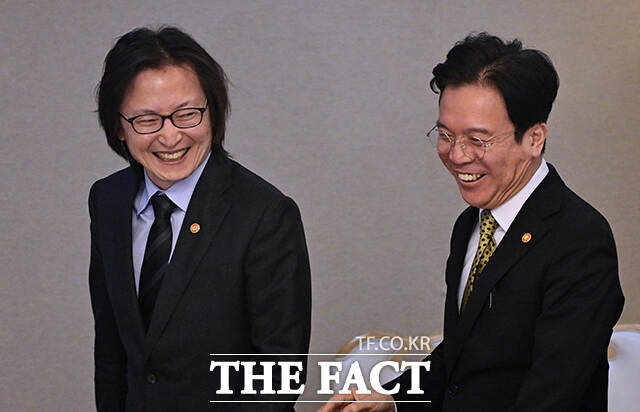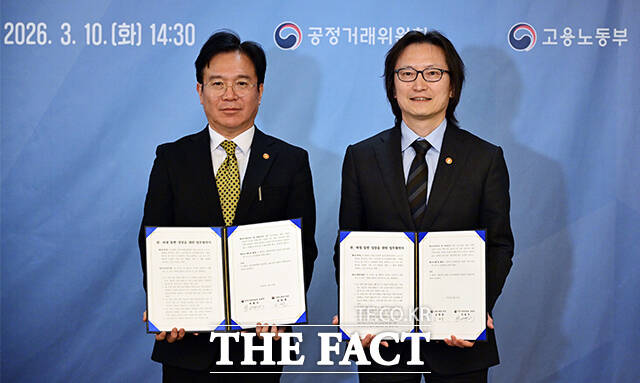 [더팩트ㅣ임영무 기자] 김영훈 고용노동부 장관과 주병기 공정거래위원장이 10일 오후 서울 종로구 정부서울청사에서 열린 원·하청 동반성장을 위한 업무협약을 체결한 뒤 기념촬영을 하고 있다.
