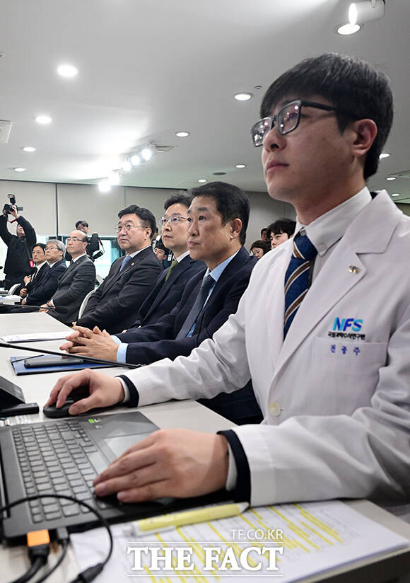 [더팩트ㅣ임영무 기자] 윤호중 행정안전부 장관(오른쪽 네 번째)이 10일 오후 서울 종로구 정부서울청사에서 AI 딥페이크 탐지 분석 모델 시연을 참관하고 있다.