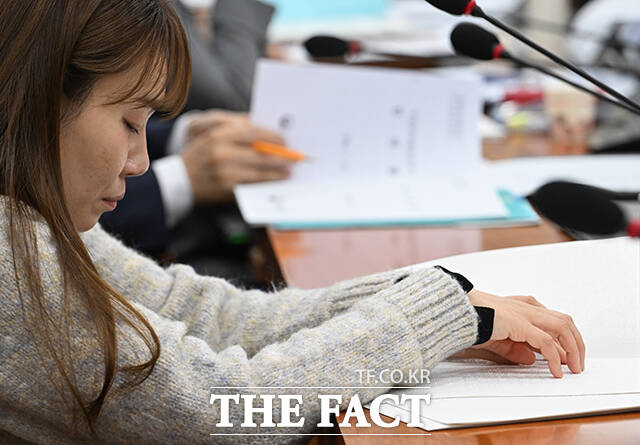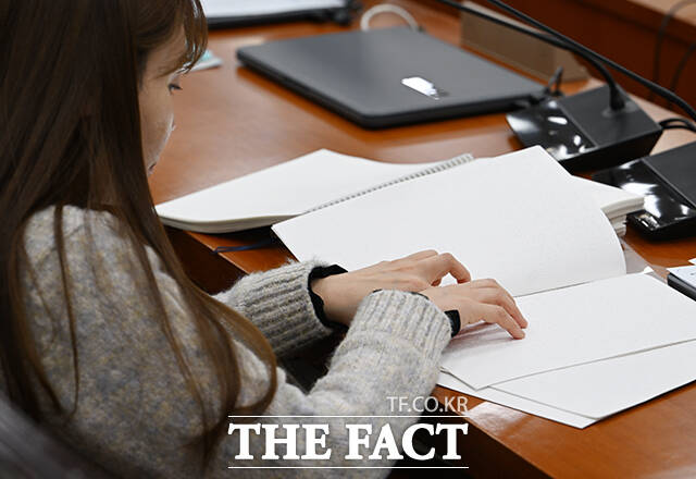 김예지 의원이 국회에서 열린 보건복지위원회 전체회의에서 손으로 자료를 읽고 있습니다.