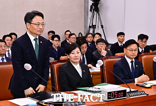 [더팩트 | 국회=배정한 기자] 박은식 산림청장(왼쪽)이 11일 오전 서울 여의도 국회에서 열린 농림축산식품해양수산위원회 전체회의에 출석해 인사를 하고 있다.hany@tf.co.kr사진영상기획부 photo@tf.co.kr