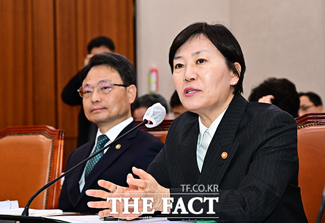 [더팩트 | 국회=배정한 기자] 송미령 농림축산식품부 장관(오른쪽)이 11일 오전 서울 여의도 국회에서 열린 농림축산식품해양수산위원회 전체회의에 출석해 질의에 답변을 하고 있다.