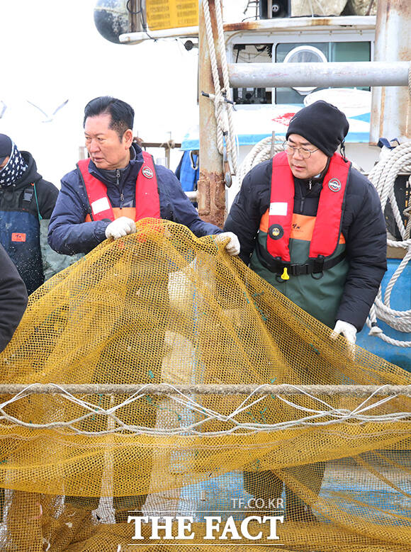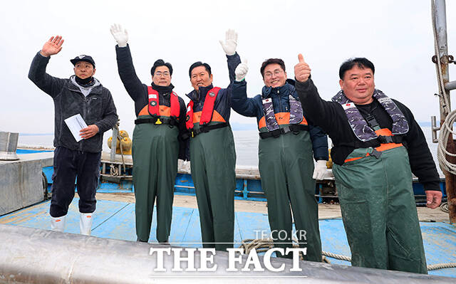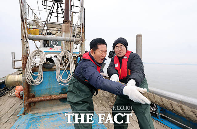 [더팩트ㅣ강화군=배정한 기자] 정청래 더불어민주당 대표(왼쪽)와 인천시장 후보로 단수 공천된 박찬대 의원이 11일 오후 인천 강화군 서검도 앞바다 조업한계선 근처 괴리어장에서 새우잡이 조업 체험을 하고 있다.