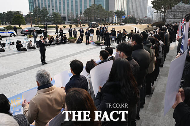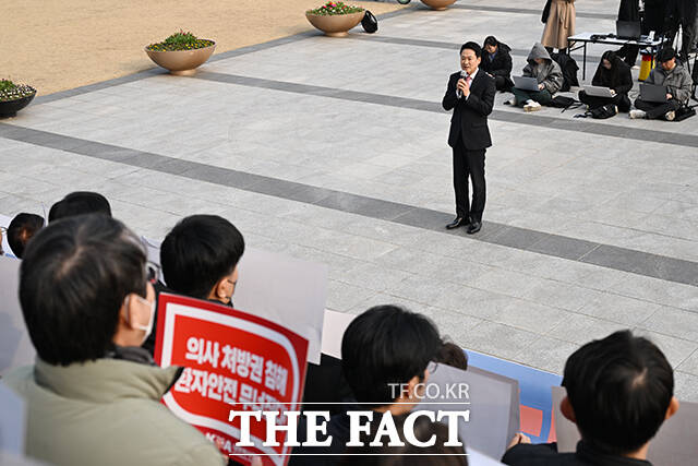 [더팩트ㅣ국회=박헌우 기자] 장동혁 국민의힘 대표가 11일 오후 서울 여의도 국회 본청 계단에서 열린 '성분명처방 저지 궐기대회에 참석해 인사말을 하고 있다.