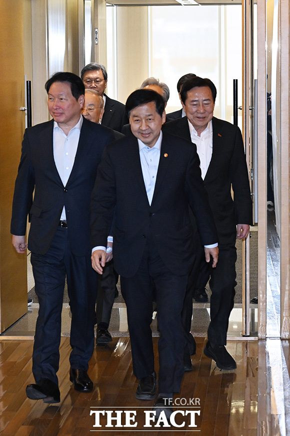 [더팩트 | 송호영 기자] 최태원 대한상공회의소 회장과 구윤철 경제부총리 겸 재정경제부 장관, 김기문 중소기업중앙회장(왼쪽부터) 등이 12일 오전 서울 중구 대한상공회의소에서 열린 '기업 혁신 지원 민관협의체 Kick off 회의'에 참석하기 위해 입장하고 있다.