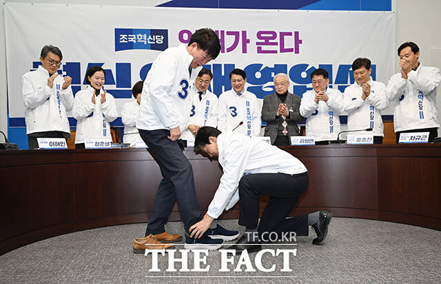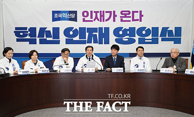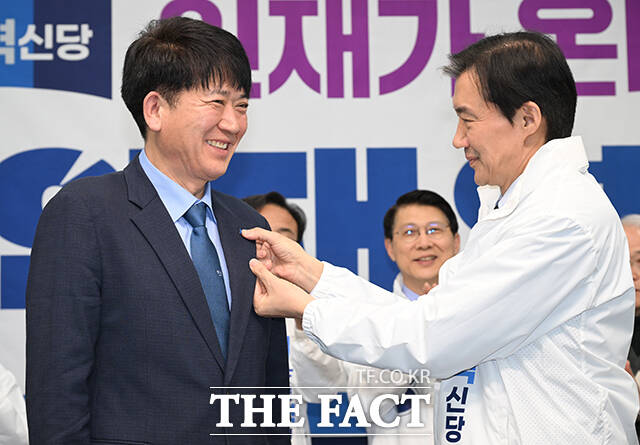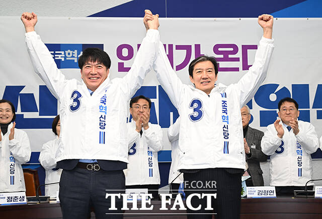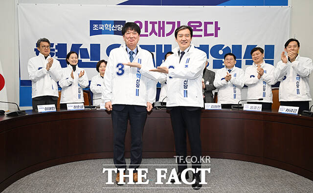 [더팩트ㅣ국회=박헌우 기자] 조국 조국혁신당 대표(오른쪽)가 12일 오전 서울 여의도 국회에서 열린 6.3 지방선거 혁신 인재 1호 영입식에서 안광호 전 인천경제자유구역청 영종청라사업본부장에게 당 점퍼를 입혀주고 있다.