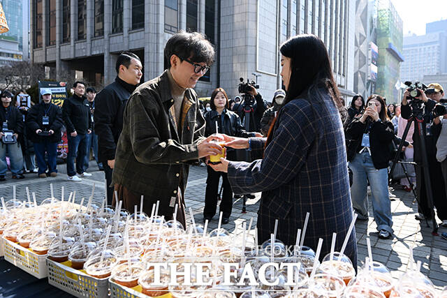 [더팩트ㅣ서예원 기자] 영화 ‘왕과 사는 남자’가 누적 관객수 1200만 명을 돌파한 12일 오후 서울 중구 서울신문사 광장에서 장항준 감독(오른쪽)이 시민들에게 커피를 나눠주며 감사 인사를 전하고 있다.