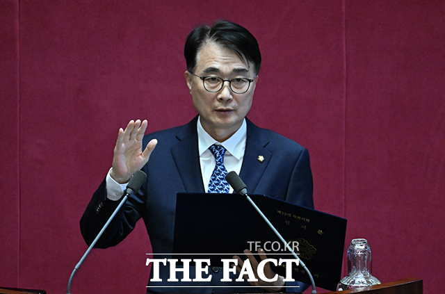 [더팩트ㅣ국회=박헌우 기자] 정을호 더불어민주당 전 의원의 청와대 정무비서관 발탁으로 비례대표직을 승계한 김준환 더불어민주당 의원이 12일 오전 서울 여의도 국회에서 열린 제433회국회(임시회) 제1차 본회의 앞서 선서를 하고 있다.