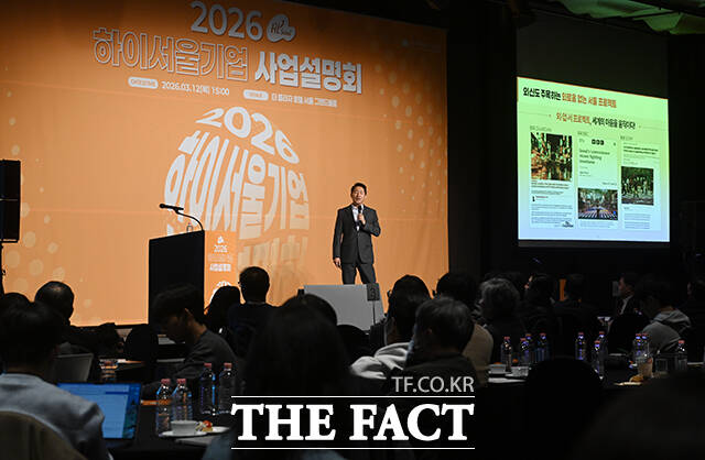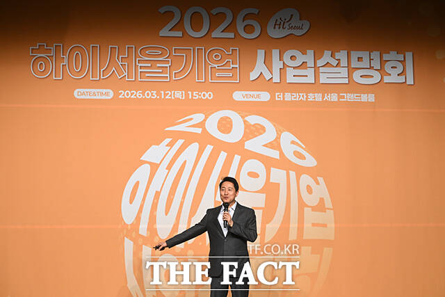 [더팩트ㅣ서예원 기자] 오세훈 서울시장이 12일 오후 서울 중구 플라자호텔에서 열린 2026 하이서울기업 사업 설명회에 참석해 특별 강연을 하고 있다.