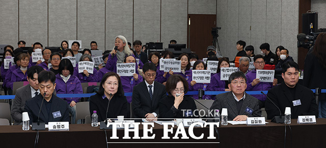 [더팩트 | 송호영 기자] 송병주 전 용산경찰서 112상황실장과 송은영 전 이태원역장, 박희영 용산구청장, 김철화 전 용산구청 건설관리과장, 김백겸 전 이태원파출소 순찰1팀 경사(왼쪽부터)가 13일 서울 중구 은행회관에서 열린 '10·29 이태원참사 진상규명 청문회'에서 유가족들의 발언을 듣고 있다.