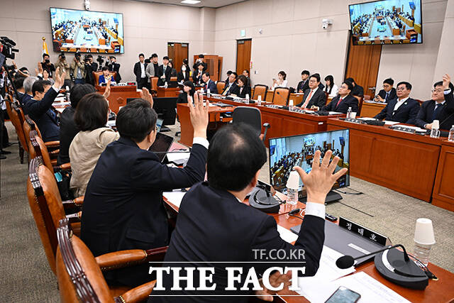 [더팩트ㅣ국회=남용희 기자] 20일 오전 서울 여의도 국회에서 열린 윤석열 정권 정치검찰 조작기소 의혹사건 진상규명 국정조사 특별위원회 전체회의에서 증인·참고인 추가 출석 요구의 건에 대해 여야 의원들이 거수표결을 하고 있다.