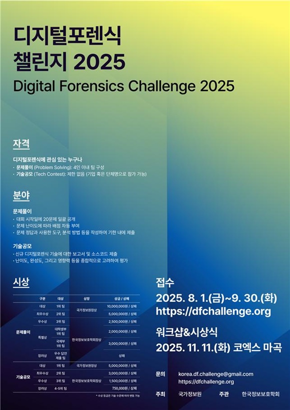 [더팩트ㅣ이철영 기자] 국가정보원은 한국정보보호학회와 공동으로 2025년 8월 1일부터 9월 30일까지 '디지털포렌식 챌린지 2025'를 개최한다.