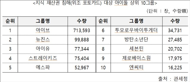 천하람(기획재정위원회) 개혁신당 의원이 29일 관세청으로부터 제출받은 자료에 따르면, 2024년부터 올해 8월까지 가장 많이 적발된 위조 굿즈는 '포카'(포토카드)였다. 적발 건수 중 가장 많은 위조 포토카드 브랜드는 걸그룹 아이브(71만3593장)였다.
