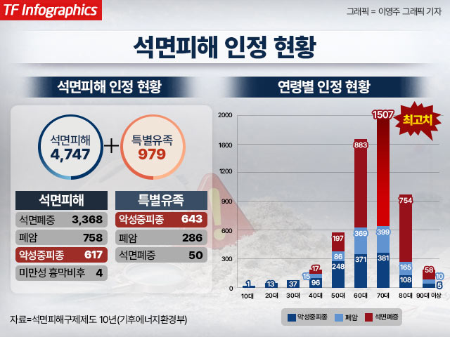 석면피해 인정 현황 역시 지난 2021년 기준으로 누적 5000건을 넘겼다. 석면이 유발하는 대표 질환 중 하나인 석면폐증은 석면섬유가 폐포에 침착한 뒤 대식세포가 이를 제대로 제거하지 못하면서 시작된다. 이 과정에서 염증세포가 유입되고 폐 조직이 점차 굳는 섬유화가 진행된다. 흉막반이나 흉막비후, 석회화 등이 동반되기도 한다. 특히 석면 노출에 흡연이 더해질 경우, 폐암 위험은 더욱 커지는 것으로 알려졌다.