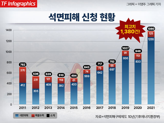 석면 피해자 수는 현재 '피크(Peak·고점)'를 찍고 있다. 기후에너지환경부가 지난 2021년 발간한 '석면피해구제제도 10년' 자료에 따르면, 석면 피해 신청 현황은 2011년 782명에서 2015년 494명으로 주춤하다가, 이후 가파르게 증가했다. 신청자는 △2016년 643명 △2017년 717명 △2018년 1027명 △2020년 946명 △2021년 1380명으로 늘었다. 석면 질환은 평균 20~40년에 이르는 긴 잠복기를 거쳐 발병한다는 점을 고려하면, 과거 건축물에 사용된 석면의 영향이 지금까지 이어지고 있다는 의미다.