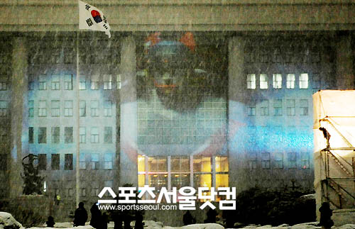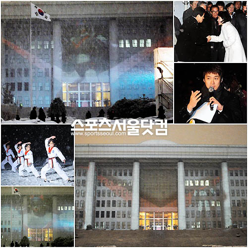 태권시범이 끝나고 눈발이 흩날리는 가운데 태권브이 주제곡이 울려 퍼졌다. 곧이어 국회의사당 벽면에 태권브이가 모습을 드러냈다. 폭설로 태권브이의 모습이 또렷이 보이지는 않았지만 국회의사당 벽면을 가득 채운 태권브이의 모습은 기개를 느끼기에 충분했다.