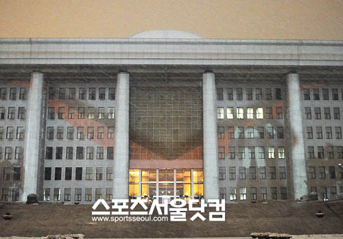 11일 오후 7시 여의도 국회의사당에 태권브이가 모습을 드러냈다. 특수 레이저빔에 의해 1975년 국회의사당 완공 후 전해져 오던 '태권브이 전설(?)'이 구현된 것.