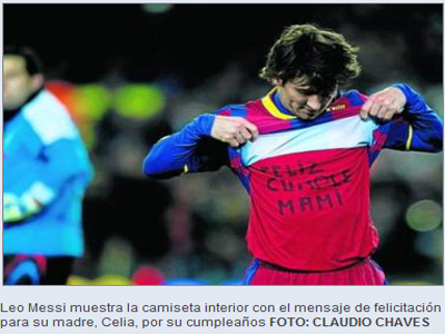 26일(이하 한국시간) 스페인 '엘 문도 데포르티보' 보도에 따르면 "메시가 지난 경기 도중 어머니의 생신을 축하하는 골 세리머니로 2천 유로의 벌금을 물게 됐다"고 전했다.