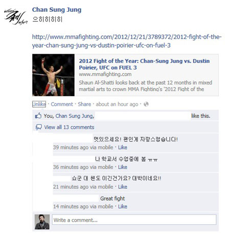 ‘코리안 좀비’로 유명한 정찬성 선수에게 경사가 생겼다. 격투기 전문 사이트 ‘MMA 파이팅(mmafighting)’이 2012년 최고의 경기로 정찬성 선수와 더스틴 포이리에의 대결을 선정했기 때문이다. 그간 화끈한 경기와 멋진 기술로 현지 팬들에게 가장 어필하는 해외 파이터 중 하나로 꼽혔는데, 이번 낭보는 그간 부상으로 인해 소식이 뜸했던 그의 존재를 다시 한 번 어필하는 기회이다.