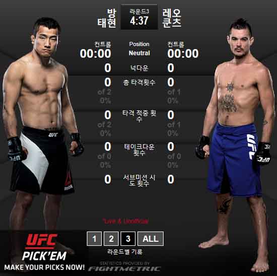 방태현은 28일 서울 송파구 올림픽공원 체조경기장에서 열린 종합격투기 대회 'UFC 파이트나이트 서울' 라이트급(70kg 이하) 매치에서 레오 쿤츠를 2대 1 판정승으로 제압했다.