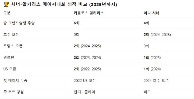 # 세계 2위 야닉 시너(2001년 8월생)도 주목해야 합니다. 시너는 조코비치에 이은 ‘뉴 호주오픈의 사나이’입니다. 메이저 4승을 기록 중인데, 절반인 2승을 호주오픈에서 달성했죠. 특히 24, 25년에 우승한 디펜딩챔피언입니다. 2019년~2021년 조코비치에 이어 대회 3연패에 도전합니다. 그는 커리어 그랜드슬램에 프랑스 오픈만을 남겨두고 있는데, 이번에 알카라스의 우승을 저지해야, 오는 5월말 열리는 프랑스에서 자신이 먼저 그랜드슬래머가 될 수 있습니다.