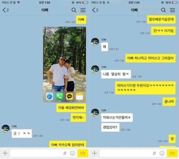 뷔는 지난달 30일 방탄소년단 공식 트위터를 통해 "언젠간 아빠도 카톡 잘하겠지?"라는 글과 함께 두 장의 사진을 게재했다. 사진 속에는 뷔와 아버지의 카카오톡 대화 내용이 담겨 있어 눈길을 끈다.특히 휴대폰 배경화면을 부모님의 사진으로 지정해 놓은 뷔의 마음이 훈훈함을 자아내고 있다.