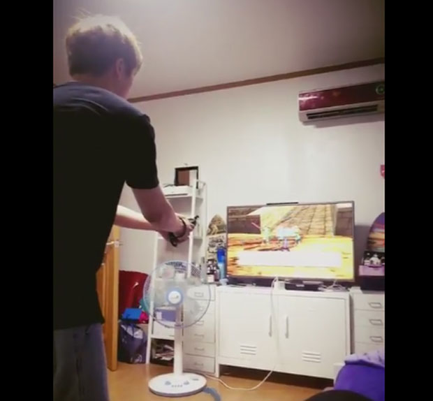 방탄소년단 멤버 진은 24일 오후 공식 트위터에 2개의 영상을 올렸다. 게임을 하면서 리모콘을 들고 검도를 하는 듯한 자세를 취하고 있다.