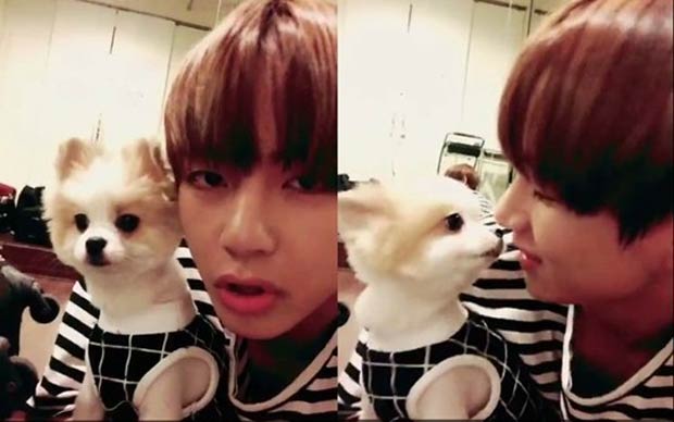 동영상 속 강아지는 뷔의 코를 핥고 입술에 뽀뽀를 하는 등 귀여운 애교를 선보였다.